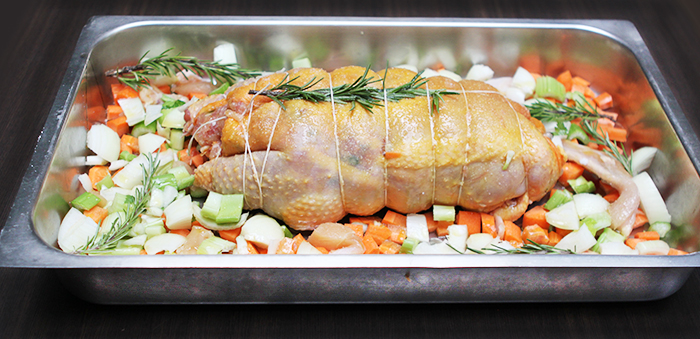 - Farcisci il cappone e legalo con lo spago da cucina. Riponilo in una placca da forno assieme al sedano, le carote e le cipolla tagliati a cubetti. Aggiungi il rosmarino, le bucce delle arance e un filo d’olio.